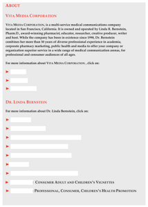 Vita Media Corporation is a multi-service medical communications company located in San Francisco, California. It is owned and operated by Linda R. Bernstein, Pharm.D., award-winning pharmacist, educator, researcher, creative producer, writer and host. While the company has been in existence since 1998, Dr. Bernstein combines her more than 35 years of diverse professional experience in academia, corporate pharmacy marketing, business development, public health and media to offer your company or organization superior service in a wide range of medical communication areas, for professional and consumer audiences of all ages.